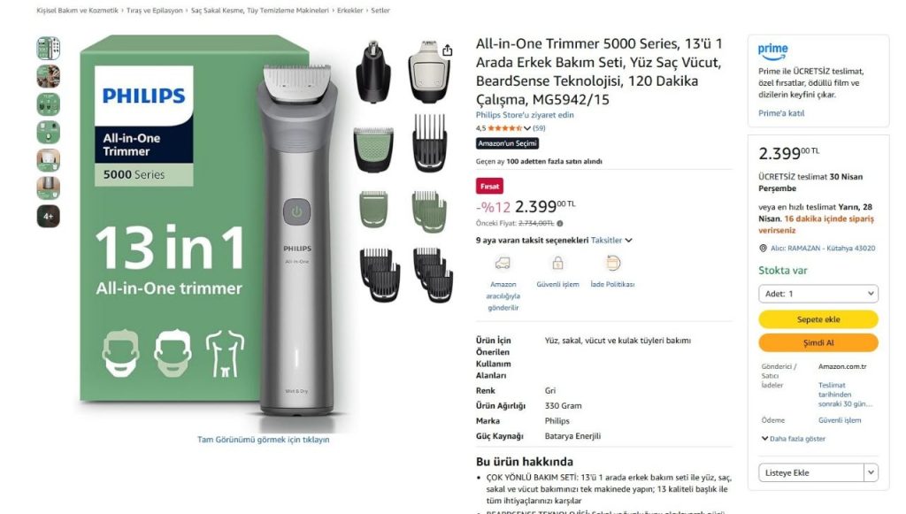 📦 All-in-One Trimmer 5000 Series, 13’ü 1 Arada Erkek Bakım Seti, Yüz Saç Vücut, BeardSense Teknolojisi, 120 Dakika Çalışma, MG5942/15