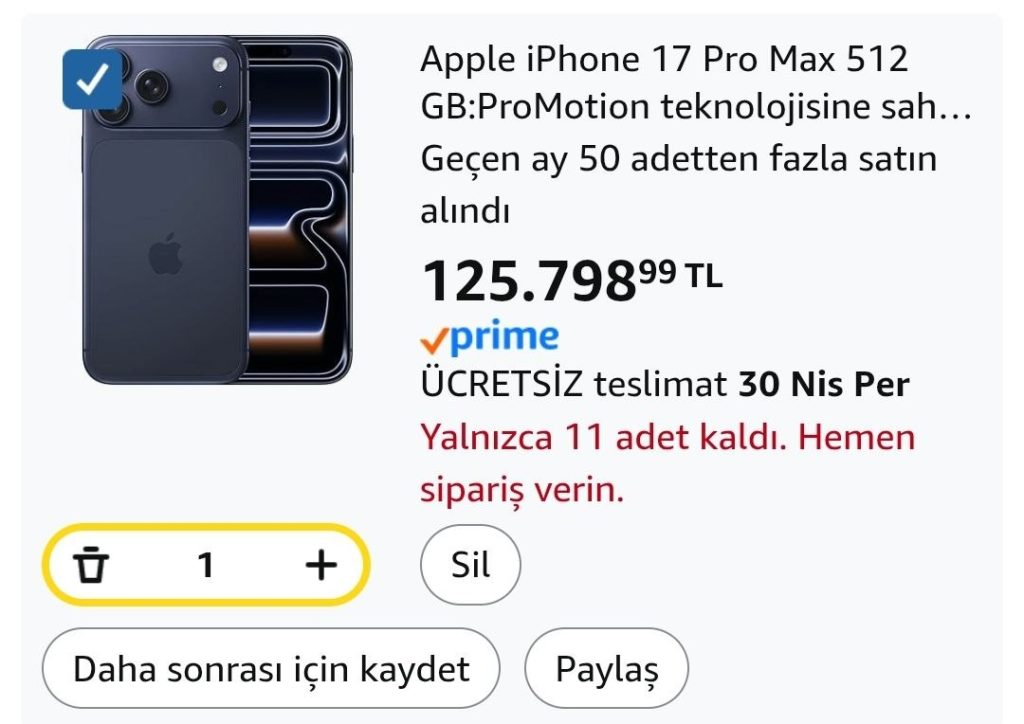 📦 Apple iPhone 17 Pro Max 512 GB:ProMotion teknolojisine sahip 6.9 inç ekran, A19 Pro Çip, Bir iPhone’da Şimdiye Kadarki En İyi Pil Ömrü, Pro Fusion Kamera Sistemi, Center Stage Ön Kamera;Abis – 125.798₺
