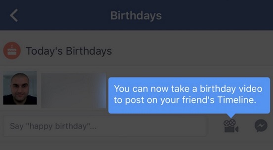 Facebook tarafından şimdilik 20 bin iOS kullanıcısına özel olarak verilen bu özellik ile belirlenmiş olan 20 bin kullanıcı, doğum günü videolarını çekerek farklı bir deneyim ile karşılaştılar. 20 saniye süre zarfında kayda alınabilen video ile doğum günü sahibine dileklerinizi iletebiliyor, doğum günü kutlamasını yapabiliyorsunuz.