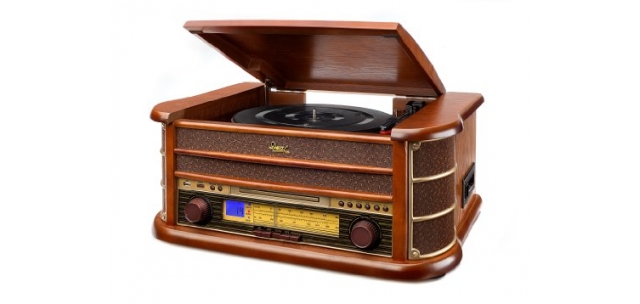 Turntable ile çift NR 4 nostalji müzik sistemi (FM radyo, MW radyo, CD-RW, MP3, USB, kaset, Aux-In) kahverengi